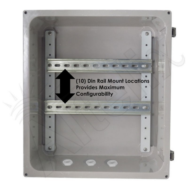 The Altelix NF141206V-DIN Weatherproof Vented DIN Rail Enclosure is ideal for protecting DIN rail mounted equipment from harsh environments and tampering, while allowing ventilation for equipment or batteries. It features two heavy duty 12 gauge steel DIN rail mounting brackets that provide 10 adjustable DIN rail mounting positions. For convenience, the enclosure also includes two pre-cut steel 35mm top-hat rails and mounting hardware.