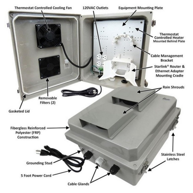 Designed to provide the ultimate all weather protection for the Starlink® WiFi Router (Gen 2), this heated and fan cooled enclosure is ideal for rapid deployment because no wiring is required. Simply mount the enclosure and plug the pre-wired 5 foot power cord into a nearby outlet. The aluminum equipment mounting plate features four pre-wired 120VAC power outlets.