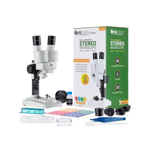 - Includes portable stereo microscope with top and bottom illumination and 20X and 50X magnifications for clear and sharp images