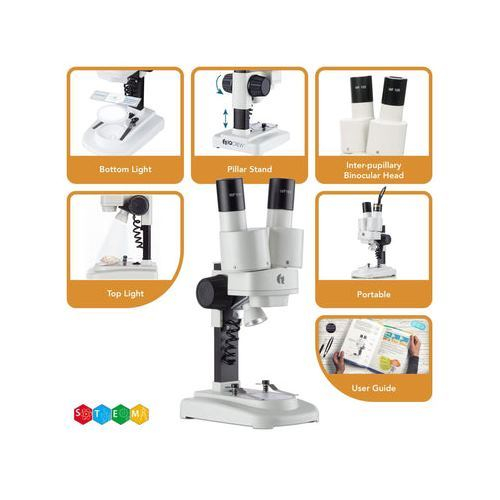 - Includes portable stereo microscope with top and bottom illumination and 20X and 50X magnifications for clear and sharp images