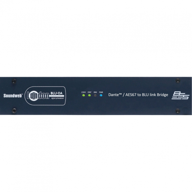 The BLU-DA also features BLU link, a low latency, fault tolerant digital audio bus of 256 channels, which uses standard Category 5e cabling giving a distance of 100m between compatible devices. Fiber media converters can be used to increase the distance between devices to over 40km.