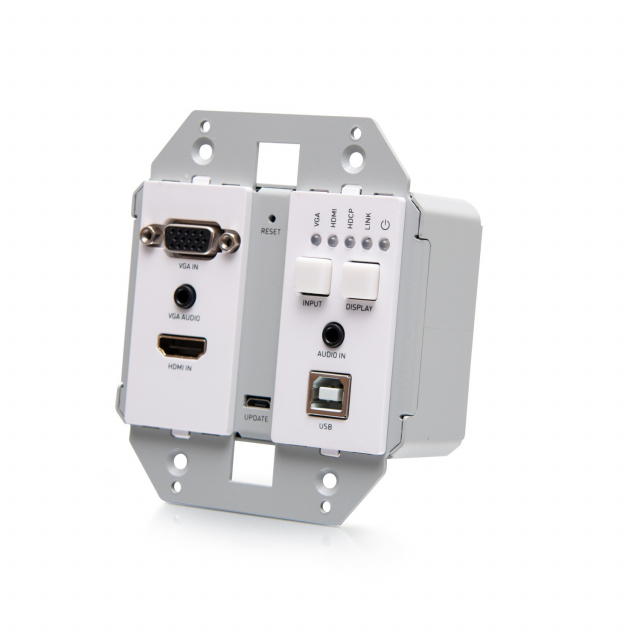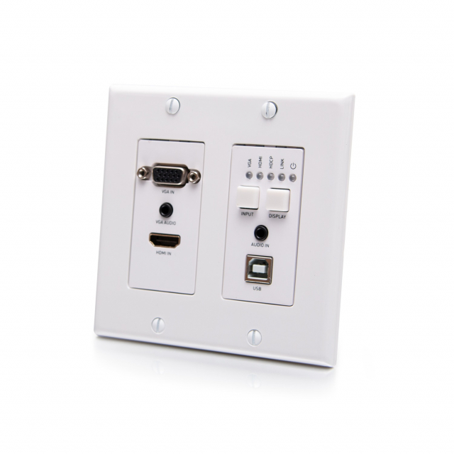 The HDMI HDBaseT + VGA, 3.5mm, and USB-B to A over Cat Extender Dual Gang Wall Plate Transmitter to Box Receiver - 4K 60Hz allows a 4K HDMI source to be extended up to 130ft to a 4K display using a single Cat6a Ethernet cable. This is an ideal solution where USB must be extended alongside HDMI video and audio to interactive whiteboards and displays in conference rooms, classrooms, lecture halls, and many other installation needs that are far beyond the length limitations of standard HDMI cabling.