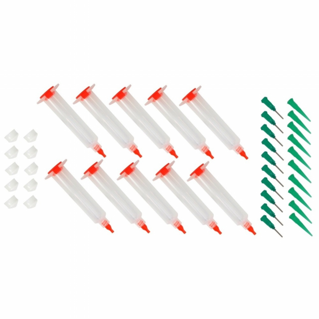 Empty plastic syringe kit. Includes syringe with accessory parts and blunt end dispensing tip. For filling and dispensing fluids and pastes, such as solder paste and solder flux, for assembling electronics.