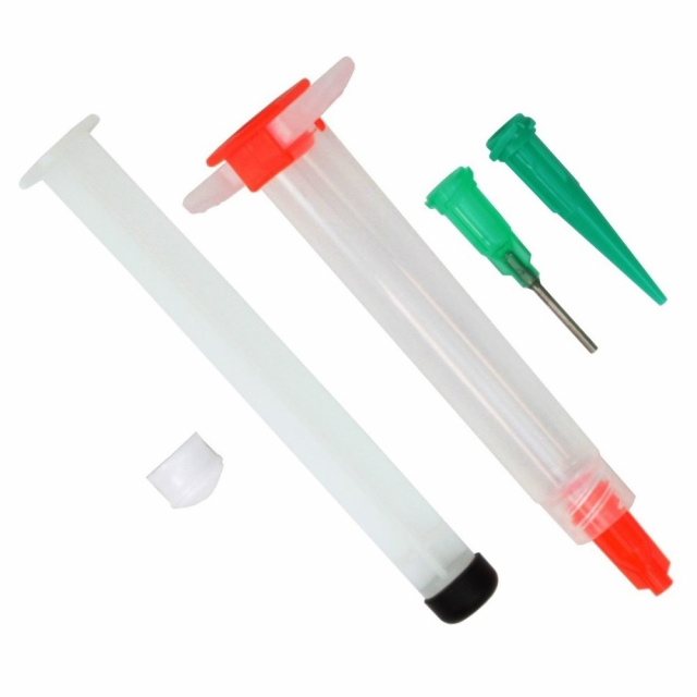 Empty plastic syringe kit. Includes syringe with accessory parts and blunt end dispensing tip. For filling and dispensing fluids and pastes, such as solder paste and solder flux, for assembling electronics.