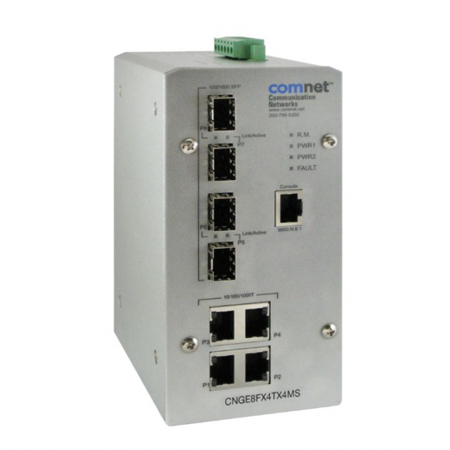 The ComNet CNGE8FX4TX4MS Managed Ethernet Switch provides transmission of (4) 100/1000 BASE-TX and (4) 10/100/1000FX combo ports. Unlike most Ethernet switches, these environmentally hardened units are designed for deployment in difficult operating environments Ports 1 - 4 support the 10/100/1000 Mbps Ethernet IEEE 802.3 protocol, and auto-negotiating and auto-MDI/MDIX features are provided for simplicity and ease of installation. Ports 5 - 8 are 10/100/1000 configurable for copper or 100/1000 fiber media for use with multimode or single mode optical fiber without need for configuration. These network managed layer 2 switches are optically and electrically compatible with any IEEE 802.3 compliant Ethernet devices. Plug-and-play design ensures ease of installation, and no electrical or optical adjustments are ever required.