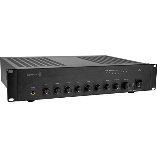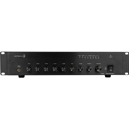 Priority muting temporarily "ducks" your background music (BGM) or other material when the Mic 1 input or the telephone input receives signal. For Mic 1, the level of reduction is adjustable from 0 - 20 dB. The Mic 1 input also offers +48V phantom power, which may be engaged or disengaged as needed. Line output is delivered via RCA jacks to feed signal to outboard equipment such as a recorder or additional zone amplifier. Dayton Audios commercial mixer-amps have a no-nonsense design for easy installation and use, and several power levels to choose from, so youre sure to find one that meets your needs. Features like 70V/100V or 4 - 16 ohm output and mic/telephone priority muting provide maximum flexibility. And, with the same uncompromising standards of quality and value youve come to expect from Dayton Audio, you know it will be sounding great for years to come.