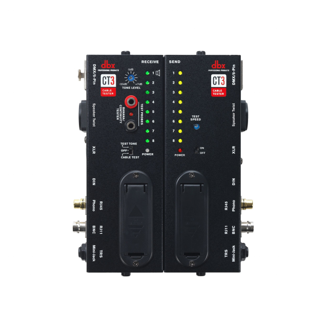 The dbx CT3 is an advanced cable testing unit allowing you to evaluate a large variety of cables with ease. The CT3 offers many common connectors such as RJ45, RJ11, MIDI, Speaker Twist, XLR, RCA Phono, BNC, DIN, TRS, TS, DMX, & Banana. It can be split into 2 parts, a SENDER and RECEIVER so preinstalled and long cables can be tested.
