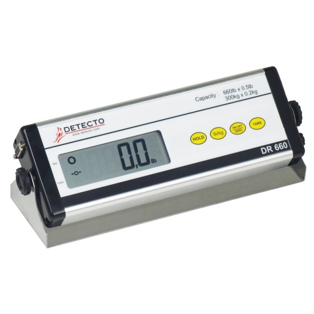 Detecto's DR660 features a lightweight spacious 21.5 W x 17.2 D x 1.97 H inch (56 W x 44 D x 5 H cm) weighing platform, built-in rechargeable battery pack (7.2 VDC / 1200mA) which is able to provide eight hours of continuous use, or 120 VAC 60Hz powering a 15 VDC 300mA wall plug-in UL/CUL listed power supply (included). 1 inch (25 mm) high LCD digits. RS232 serial output and integral carrying handle. 660 lb x 0.5 lb / 300 kg x 0.2 kg capacity.