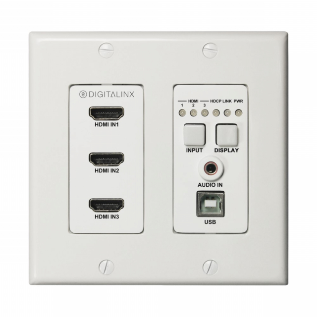 DigitaLinx, DL-3H1U-WP-W, 4K 10.2G 100m 3 HDMI Wall Plate with Pass-Through Audio, USB2.0 High Speed, Display Control, and 1 Way PoH