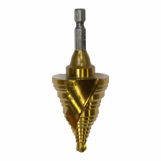 Spiral Step Drills provides up to 4 x faster cutting than Standard Two Fluted Step Drills, continuous cutting action allows for faster, cleaner hole enlargement. Titanium Nitride coating extends the of the bit, M35 Cobalt provides strength and durability.