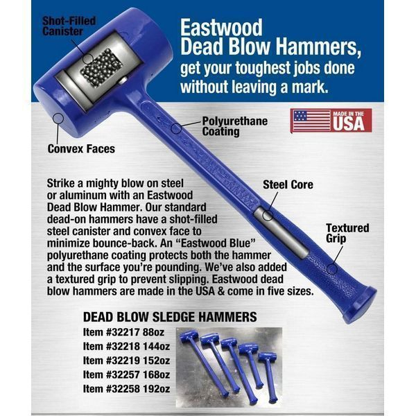 Make a much-needed dent in metalworking projects using an Eastwood sledgehammer dead blow mallet that's built for power. It delivers the high-force, wide-area impact of a traditional sledgehammer with minimal blowback. Design features such as a shot-filled canister and polyurethane coating prevent unwanted damage to the project material. Eastwood dead blow hammer is made in the USA and last up to 20 times longer than other hammers.