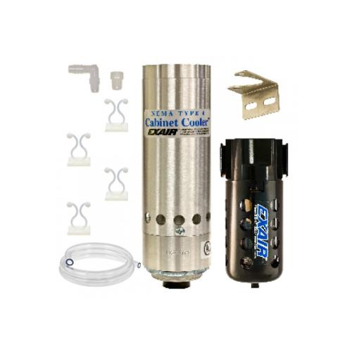 The compact Cabinet Cooler can be installed in minutes through a standard electrical knockout. NEMA 4X (IP66) Cabinet Coolers (dust-tight, oil-tight, splash resistant, corrosion resistant, indoor/outdoor service) incorporate a low pressure relief valve for both the vortex tube and cabinet air exhaust. This valve closes and seals when the cooler is not operating to maintain the integrity of a NEMA 4X enclosure. NEMA 4X (IP66) Cabinet Coolers are constructed of stainless steel for food service and corrosive environments. All Cabinet Coolers are UL Listed and CE compliant.