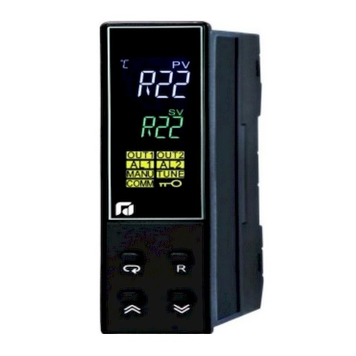 Future Design Controls Multi-Color LCD display R-22 Series set a standard for DIN temperature controllers packed with performance to meet OEM needs while providing reliable High Performance temperature and process control.The multi-color LCD display, configurable space for output annunciation, PID % output, count down timer or Profile information provide operators with an ease of use not found in this class of instruments. In addition the SEL function provides additional flexibility operator ease of use by allowing configuring those parameters significant to the operator (up to 8) to display in sequence when the scroll key is depressed. P, I, D, Shift, Cycle 1, deadband, etc., or nothing displayed.