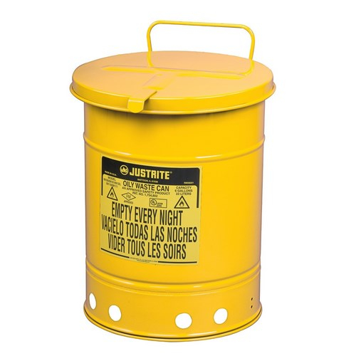 Rags and cloths soaked with solvents, thinners, linseed oil, combustible adhesives and other flammable liquids present a serious fire risk when improperly discarded. Lid opens to no more than 60 degrees and stays closed when not in use, isolating contents from fire sources and limiting oxygen to virtually eliminate the risk of spontaneous combustion. Round construction and elevated base allow circulation of air around can to disperse heat and reduce moisture build-up and rusting. Durable steel construction with a powder-coat finish provides chemical resistance.