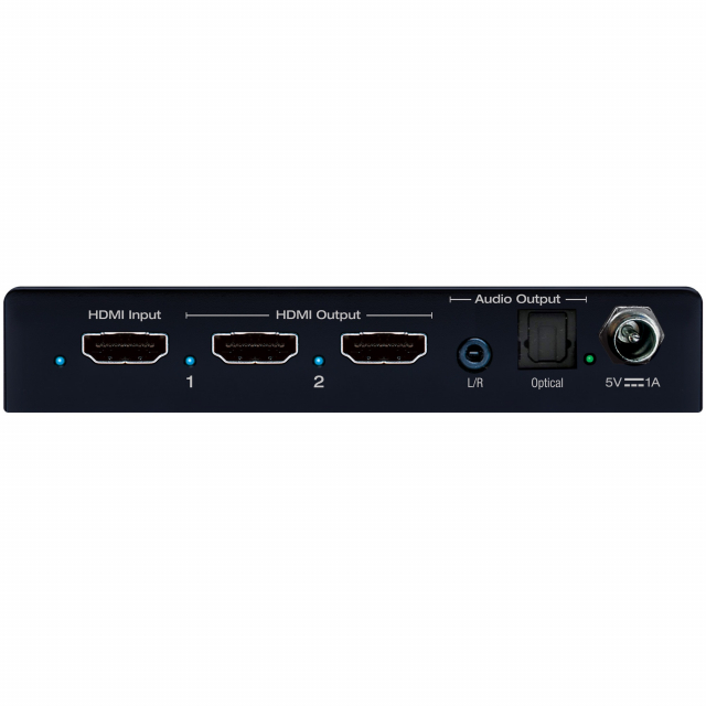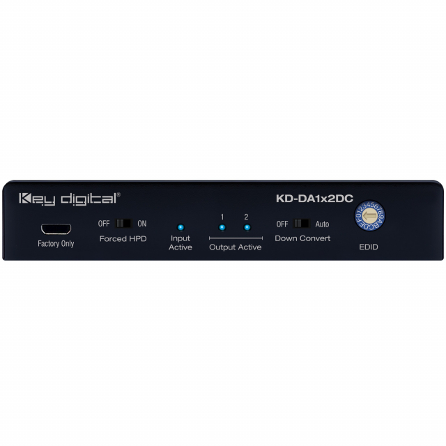 KD-DA1x2DC is an HDMI splitter/distribution amplifier with 4K 18G resolution signal support and a 4K to 1080p resolution down conversion option. This enables a single HDMI video source to be displayed on multiple video displays, regardless of 4K or 1080p resolution support.