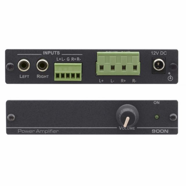 The 900N is a high−performance power amplifier for balanced or unbalanced stereo audio signals. Either input can deliver a speaker output of 10 watts RMS power per channel into a 4Ω load.