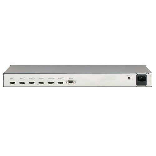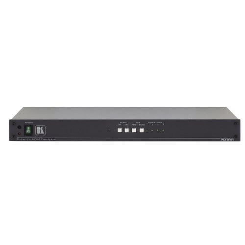 The VM-24H is a distribution amplifier for HDMI signals. The unit reclocks and equalizes one of two selectable Input signals and distributes it to four identical Outputs.