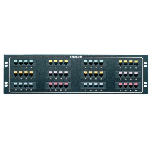 Legrand modular quadframe 19" telco panels provide RJ21 50-pin connectors wired to RJ11, 2-contact jacks. These panels are commonly used to support voice, alarm and low-speed data applications.