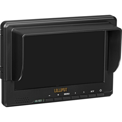 Lilliput's 667GL70NP/H/Y On-Camera Video Monitor provides 800 x 480 resolution with 400 nit brightness and an 500:1 contrast ratio. It supports NTSC and PAL compatible signals and features HDMI, Component, and Composite inputs. It features a built-in speaker, a sun hood, and an IR remote control. On the face of the monitor are the IR receiver, a battery power indicator, volume up and down buttons, a menu button, left/right select buttons, input select and a power button.