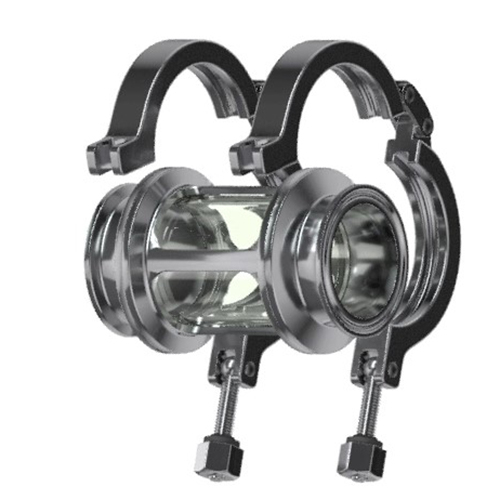 Designed to be mounted in-line for high purity hygienic applications, these clamp type "CT" sterile-design visual flow indicators provide operators with a clear view of flow for virtually any process pipeline fluid or powder. They feature an internal-flush style based on a unique O-ring seal design that minimizes traps where bacteria can build up. Polished stainless steel sanitary clamp connections are standard with orbital weld, Swagelok TS, flange or union connections as special order items.
