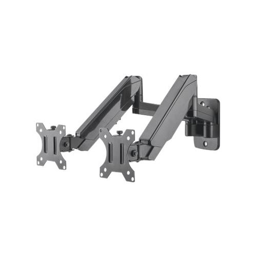 This Manhattan Universal Gas-Spring Dual Monitor Wall Mount offers two jointed gas-spring arms that securely hold two 17" to 32" TV or monitors. This mount's Gas-Springs promote easy movement of the monitors or TVs to a more comfortable viewing angle with the lightest touch. Designed to give back much needed desktop real estate and maximize productivity, the Manhattan Universal Gas-Spring Dual Monitor Wall Mount provides more flexibility, reach, and overall enjoyment of whatever task is at hand.