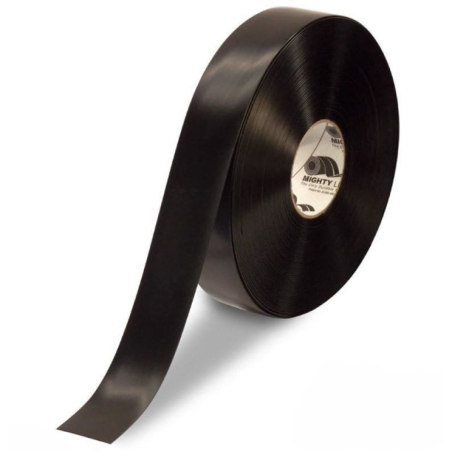 Patented Mighty Line Safety Floor Tape 2 inch by 100 foot black industrial floor marking tape. Mighty Line peel and stick floor tapes have beveled edges. Mighty Line floor tape is great for industrial facilities. Mighty Line black floor tape is great for 5s, lean manufacturing, six sigma, and floor marking tape applications.