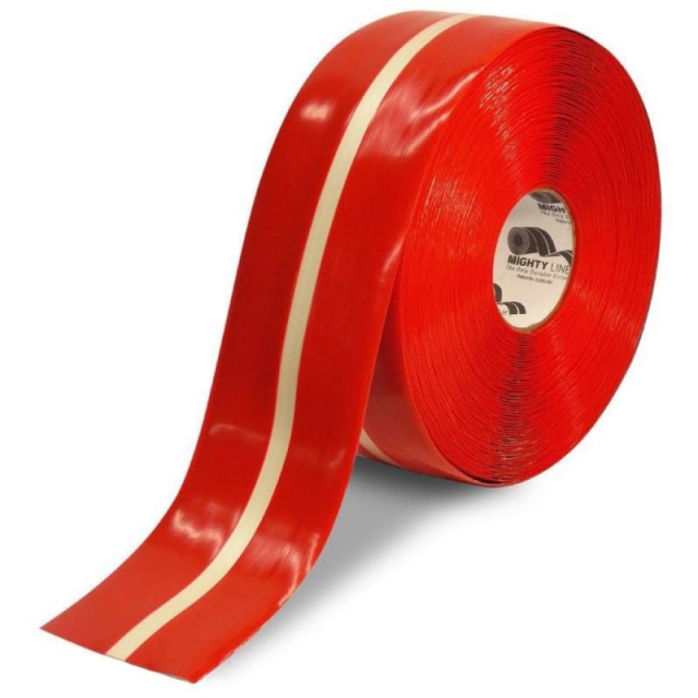Patented Mighty Line Floor Tape & Safety Floor Tape 4 inch by 100 foot red with glow center line industrial floor marking tape. Mighty Line peel and stick floor tapes have beveled edges which improves durability in harsh industrial environments. Mighty Glow is a great safety solution when the power goes out in the warehouse.