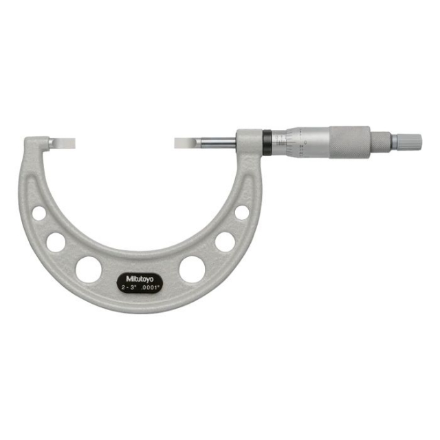The Mitutoyo mechanical blade micrometer utilizes a blade anvil and spindle for measuring difficult pieces such as groove diameters of shafts and keyways. The non-rotating spindle reduces torsion on softer parts being measured and prevents workpiece deformation and wear. A ratchet-stop mechanism provides uniform pressure on a workpiece for precise, repeatable measurements.