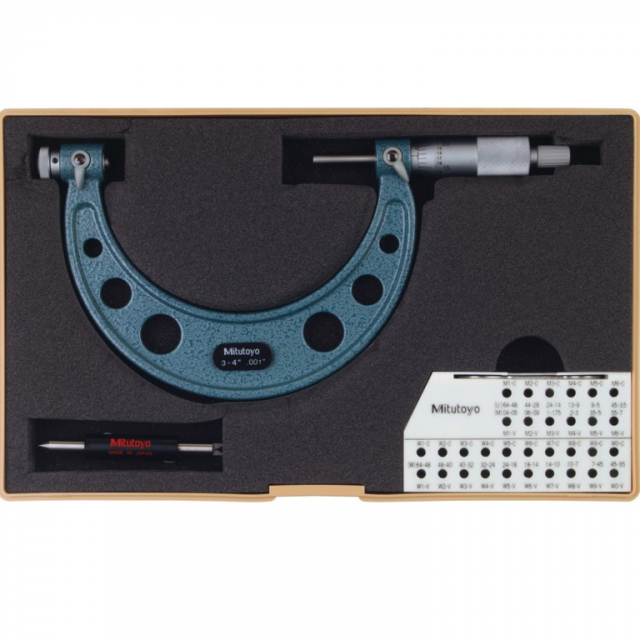 The Mitutoyo screw thread micrometer uses interchangeable anvils and spindle to perform accurate measurements of different types of screw thread pitch diameters faster and easier. The Mitutoyo screw thread micrometer uses optional V-Anvil and conical spindle inserts interchangeably to precisely measure pitch diameters of metric or unified screw threads. A ratchet-stop mechanism provides uniform pressure on a workpiece for precise, repeatable measurements.