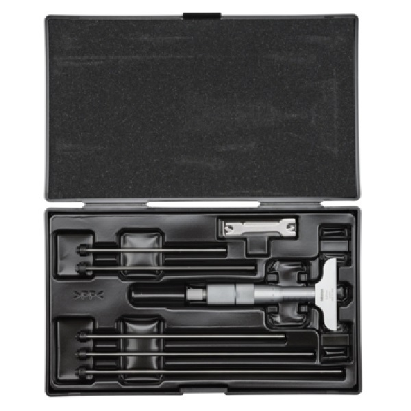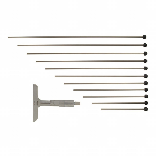 The Mitutoyo interchangeable rod-type depth micrometer offers great versatility for measuring a range of depths with the included extension rods. The depth micrometer's rod contact measuring points are lapped and carbide tipped for incredible flatness and better precision. The ratchet stop mechanism provides uniform pressure for precise, repeatable measurements.