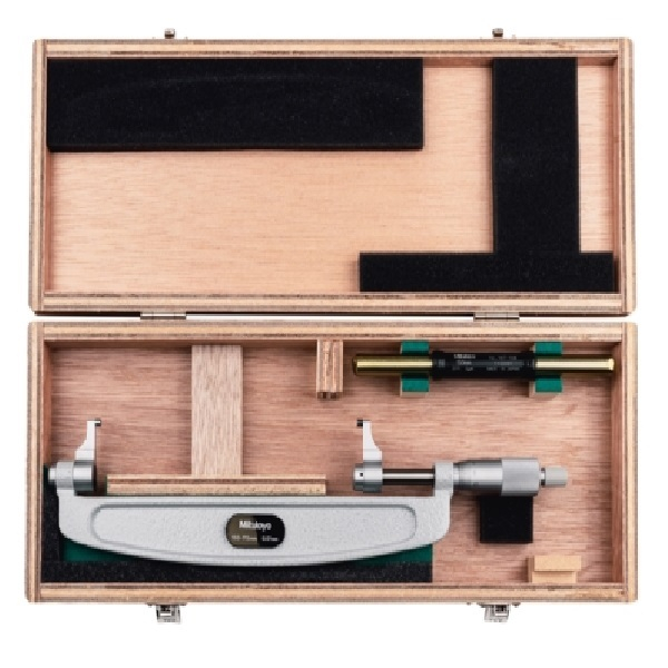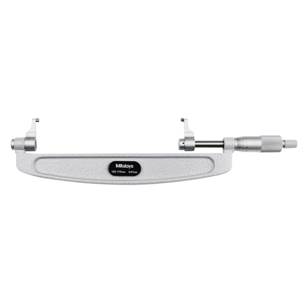 The Mitutoyo caliper-type micrometer features jaws constructed of hardened steel with carbide measuring surfaces and a hardened steel spindle to take precise measurements on recessed features. The micrometer's ratchet stop mechanism provides a constant measuring force on the spindle to ensure accurate, repeatable measurements. The combination of the ratchet thimble and speeder enables a rapid spindle feed when measuring extensive dimensions for easy one-handed measurements.