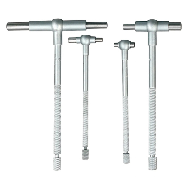 The Mitutoyo telescoping gage set allows measuring diameters of holes and openings quick, easy and accurate. Hardened steel plungers operate smoothly with a balanced spring, and each plunger has hardened contacts ground to a radius for true fit and measurements. These telescoping gages are used with outside micrometers for measuring inside hole and openings.