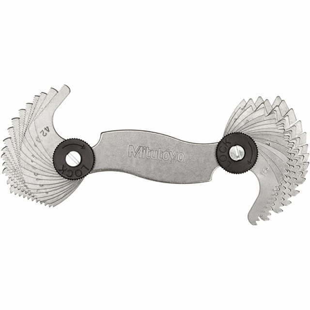 The Mitutoyo screw thread pitch gages are constructed of high-grade stainless steel for reliable and highly accurate thread pitch measurements. Each leaf has the pitch size stamped on it for fast and easy viewing. Locking clamps keep the gages in place while in use or in storage.