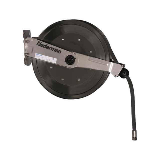 The corrosion resistant hose reels have a stainless steel stand and swivel, brass hub, and a composite material drum, which makes them suitable in humid conditions. Thanks to the open design, the reels are very easy to service, maintain and keep clean. The reel can be installed on wall or on the ceiling. Series 889 reels are fitted with slightly larger drums and therefore are able to take longer hoses than Series 888. The Corrosion Resistant Reel is suitable for installations in humid conditions such as carwashes, and exposed outdoor areas. All components are manufactured in highly corrosion resistant materials.