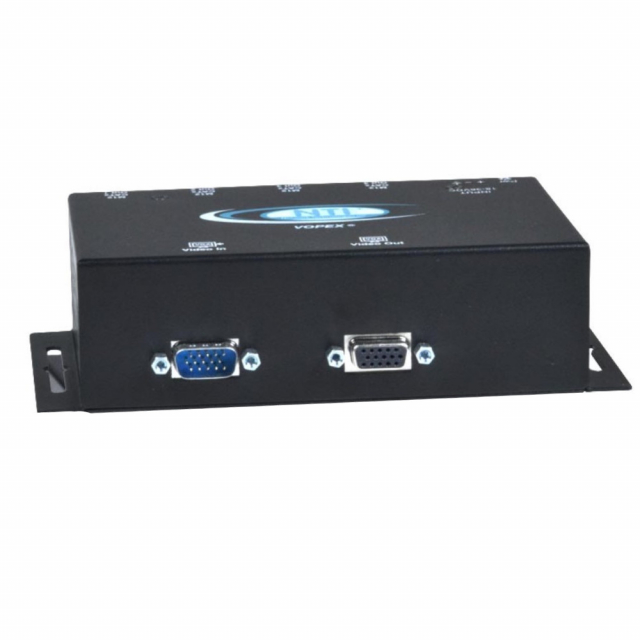 VGA video splitter/extender system has two components: the VOPEX-M12V-x VGA broadcast unit, which connects to the host computer and also supplies video to a local monitor, and an XTENDEX® ST-M12V-R-600 remote unit for each remote monitor. The units are interconnected by CAT5/5e/6 cable terminated with M12 connectors.