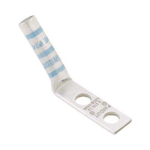 Two-hole, flex lug, long barrel, #6 AWG wire, 1/4 stud hole, 0.63 hole spacing, 45° angle tongue.