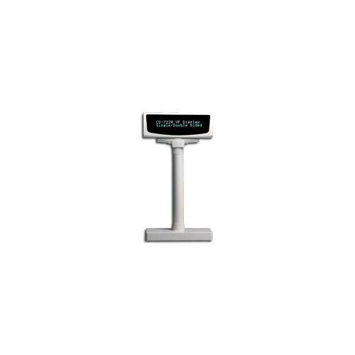 The CD-7220 Series Customer Pole display uses a vacuum fluorescent display (VFD) tube presenting bright and easy to read characters. Because of the VFD technology, the display is viewable from a wide angle. Customers will appreciate Not having to remain in a fixed viewing position to see the display. The CD-7220 Series Customer Pole display has two pole sections giving you the choice of four different display heights. The display can be rotated up to 270 degrees. The head of the display can tilt up to 35 degrees maximum. The combination of these features gives you the flexibility to tailor the display position to your unique application. The CD-7220 Series D provides Dual independent displays. You can choose to show the same or different messages with a single Pole display. with two lines of twenty characters on each side, the CD-7220 Series D can display 96 alphanumeric messages with 13 international characters. Additionally, a software utility is provided to transfer character dot patterns to ASCII code giving you the ability to define characters and demo messages to download to the display EPROM. The CD-7220 Series Customer Pole display uses an easy to connect RS-232C serial Port connection with a wide range of available communication speeds from 300 to 38,400 bps. The CD-7220 Series pass-through function allows you to connect Another serial device by sharing one single serial Port on the hOSt system. The CD-7220 Series also offers a variety of emulation modes including Epson, Aedex, Emax, and Ultimate.