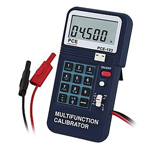 The PCE-123 is a network-independent multifunction calibrator used to test and calibrate a variety of parameters of controllers and measuring instruments. Offering a high level of accuracy for an affordable price, this easy-to-use calibrator provides electrical (mA, mV, V and frequency in Hz) and temperature (in °C or °F) output signals, making the calibrator useful in a wide range of applications. The calibrator also has automatic step and ramp functions as well as the possibility to pre-select the output signal steps (0 - 100 %) by using the arrow keys and to directly specify an output value (e. g. 13.8 mA). Operation via the keypad is very easy and intuitive. The PCE-123 multifunctional calibrator is an important tool in any electronics workshop as well as in any measuring and control department in trade, industry and automation.