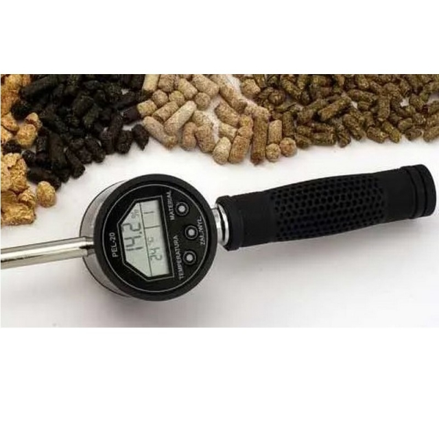 The humidity detector was designed in collaboration with biomass power plant operators. Since the heating value of pellets depends strongly on its moisture the humidity detector ensures high efficiency. The humidity detector performs a resistance moisture detection. This means that the humidity detector measures the resistance of the test sample in order to gain information about its moisture due to its characteristic curve. Therefore it is of great importance to select the appropriate characteristic curve and temperature of the humidity detector. The humidity detector is applicable for comparative measurements of pellets that are made of either sawdust, wood chips, straw, hay, scraps of pellets, shells of sunflowers, buckwheat, corn, soy, etc. Therefore, simply plunge the 1000 mm long sensor into the pile of pellets and the measuring data will be collected after its stabilization. The humidity detector only measures at the tip of its sensor-probe. It is advised to perform several measurements at different points in order to achieve an adequate overview of the water content of the pile. Thus the humidity detector helps providing quick, easy and low-cost information about pellets moisture.