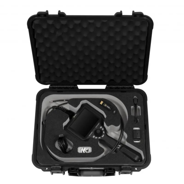 The detachable Li-ion battery enables flexible and mobile use of the industrial borescope without having to rely on an external power source. The 4-way camera head enables comprehensive monitoring and inspection from different angles. For optimum illumination in dark environments, the industrial borescope is equipped with LED lighting via fibre optics, which ensures uniform and intensive illumination. HDMI image transmission enables high-resolution live transmission of the inspection image to external monitors or recording devices.
