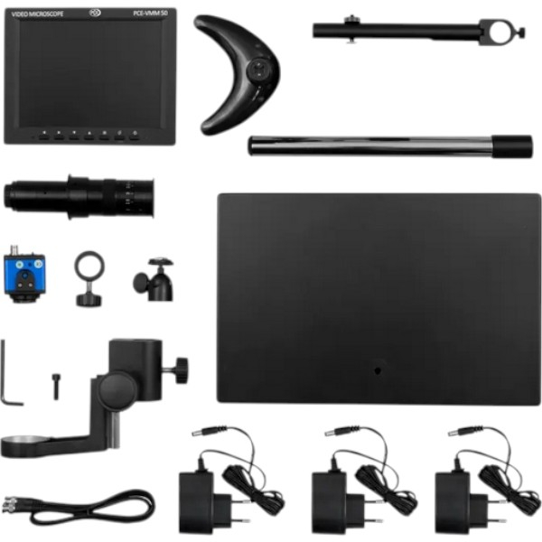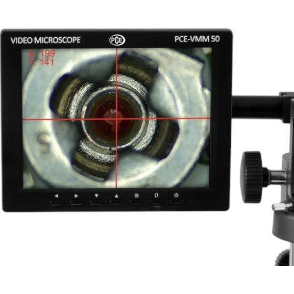 The camera microscope PCE-VMM 50 is a microscope with a large sample support surface of 380 x 225 mm / 15 x 8.9 in. This makes it possible to freely position even larger samples on the camera microscope. On the 7-inch LC display, the camera microscope, the samples can be analyzed directly. In addition, the LC display can be disassembled from the camera microscope and positioned by the supplied stand, freely on the workstation.