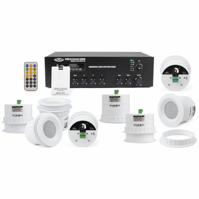 This multi-area coverage office sound masking system reduces distractions from noisy co-workers, office equipment, telephones, and outside noises while also protecting speech privacy. The white noise blends into the background making your office space, shared workspace, corporate business establishment, open office floor plan, office lobby and hallways, and other business applications more acoustically comfortable, which can increase workplace productivity. This sound masking system is extremely versatile and simple to use, it combines four sleek 3" ceiling speakers and four compact and lightweight 3" surface mount speakers with the MA60BT Bluetooth mixer amplifier and a PrivacyCard™ for plug-n-play sound masking white noise in offices. Plug it in and instantly mix proprietary masking white noise system with background music and paging in any business space.