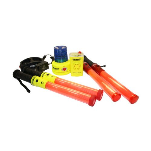 Inspired by working airline officials, this marshaling tool was developed based on the ideas and experience of the hardworking men and women in ground support. This system can also be used to improve intermodal operations. This universal kit is used inside and outside of the U.S.