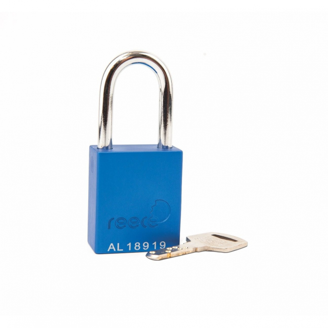 Reece Safety, AL38BLU, 1-1/2" Aluminum Safety Padlock, 1-1/2" Steel Shackle, Keyed to Differ, Blue