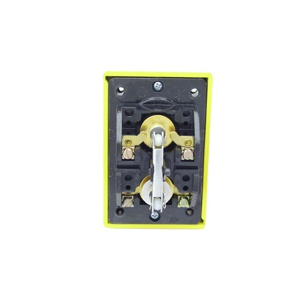 The following switch is a hand operated, control circuit device, rated 'Heavy Duty' normally for use with electromagnetic equipment. The yellow cover, painted with a dry powder paint, is made from die-cast zinc. The red plastic mushroom plunger head is solid color throughout.