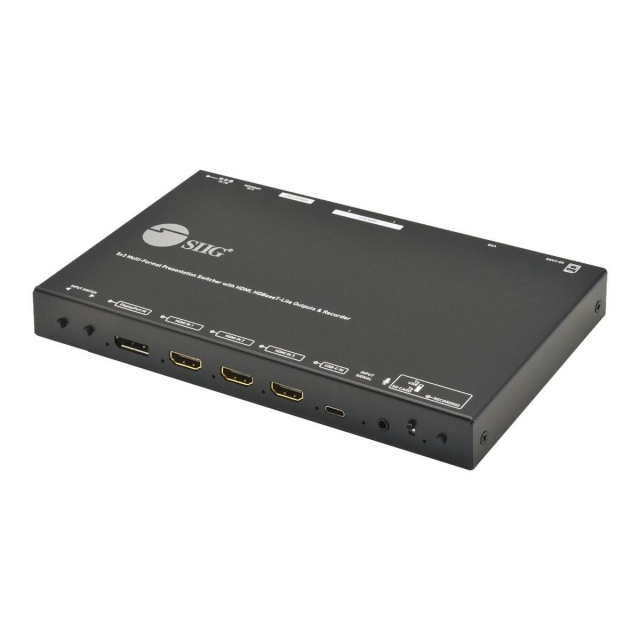 A multi-in-one presentation switcher with video/audio recorder functions in one compact device, five inputs (1 DisplayPort, 3 HDMI, 1 USB-C), two HDMI and one HDBaseT outputs, allows recording video and audio to USB flash drive or SD card