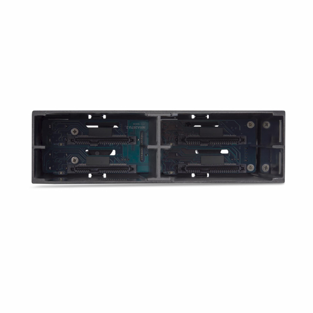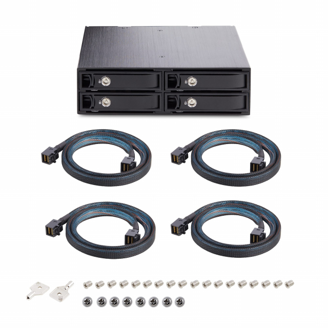 This 4-Bay Drive Backplane or Mobile Rack facilitates the installation of up to four 2.5-inch U.2 (SFF-8639) NVMe SSD/HDDs within a single 5.25-inch bay. Enhance security and stability with lockable drive trays, providing an additional layer of protection while preventing accidental hot swaps*. The LEDs provide a visual indication of individual drive status and activity. *Hot swap support is dependent on host computer PCIe hot swap capability. The Aluminum body is designed to facilitate heat dissipation ensuring optimal temperatures for the drives. Two rear cooling fans provide two adjustable airflow settings, ensuring reliable and sustained performance. This mobile rack includes four 2ft (61cm) Mini-SAS HD Cables, and drive/backplane mounting screws. Power the drives through a single SATA Power connection from the desktop/server power supply.