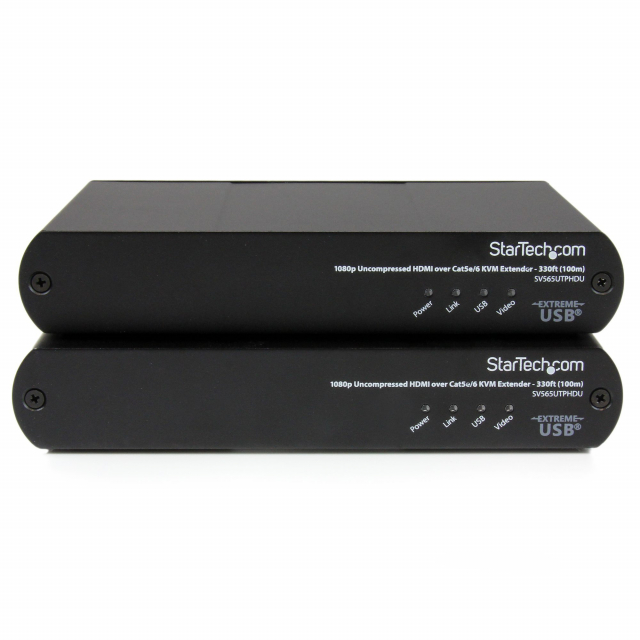 The SV565UTPHDU USB HDMI KVM Extender lets you control a PC from up to 330ft (100m) away over a single Cat 5e or Cat 6 cable connection, with uncompressed 1080p HDMI video and access to up to 3 connected USB devices. A flexible solution for powering large high-definition displays remotely, this HDMI USB extender supports uncompressed 1080p or 1920x1200 video resolutions at maximum distance. Additional features such as 3D support, HDCP, CEC and Lip Sync pass-through enable you to display your content exactly as you need it on the remote display. This versatile KVM console extender can be connected to a single system, or cascaded to an existing KVM switch for remote operation of multiple systems, and features 3 USB 2.0 ports on the remote end, allowing you to connect a keyboard, mouse, printer or other peripherals. Since the extender uses Cat 5e (or better) network cable, you have the option to use existing infrastructure wiring, which helps avoid the hassle and expense of running bulky video cables.