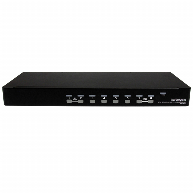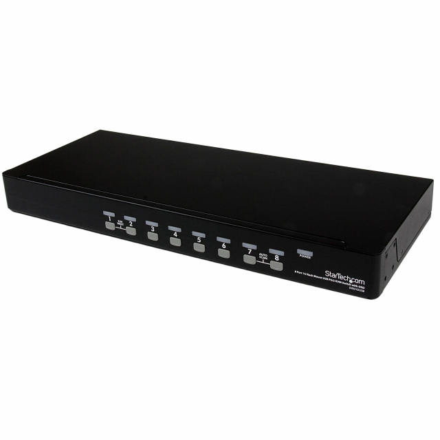 The SV831DUSB 8 Port 1U Rack Mount USB PS/2 KVM Switch with OSD offers a dependable computer management tool that allows you to control up to 8 USB or PS/2 connected computers from a single keyboard, mouse and monitor. The KVM switch offers maximum control, allowing you to switch computers using hotkey commands or front panel push-buttons, and offers the added convenience of an On Screen Display to quickly access configuration options. A suitable addition to server room operations, the 8 port switch can be rack-mounted into 1U of cabinet space, and can be cascaded with multiple KVM switches to deliver control of up to 56 computers from this single switch.
