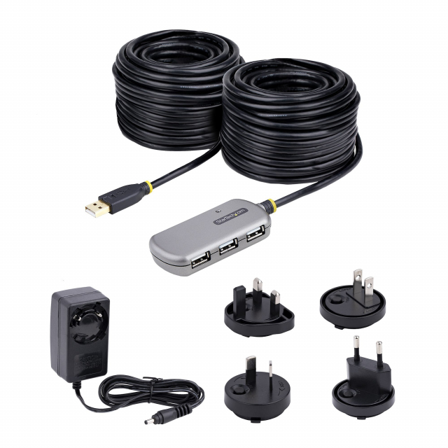 - Long-range active USB extender: USB-A hub with 4x USB 2.0 ports and active extension cable 78.7 ft (24 m); power the USB extension cable via bus power or included power adapter; add a second USB extender hub for maximum distance of 157.4 ft (48 m)